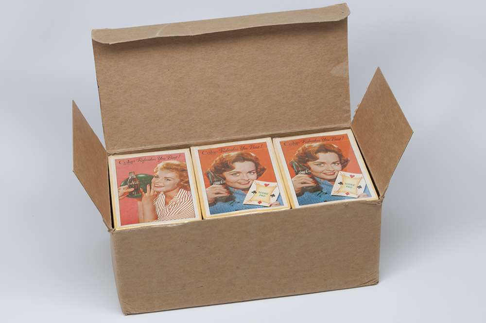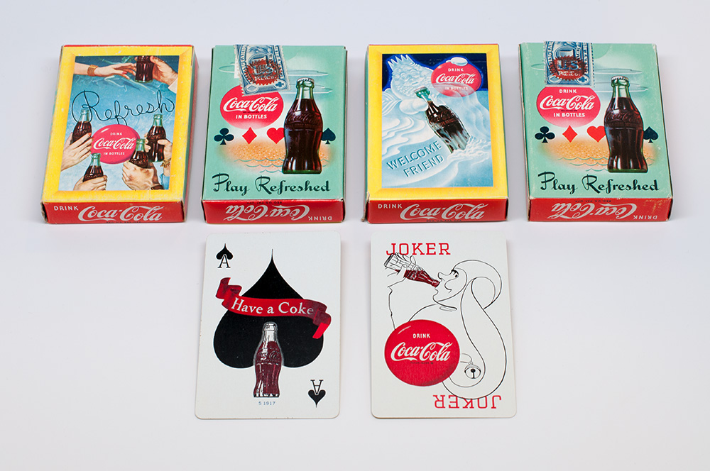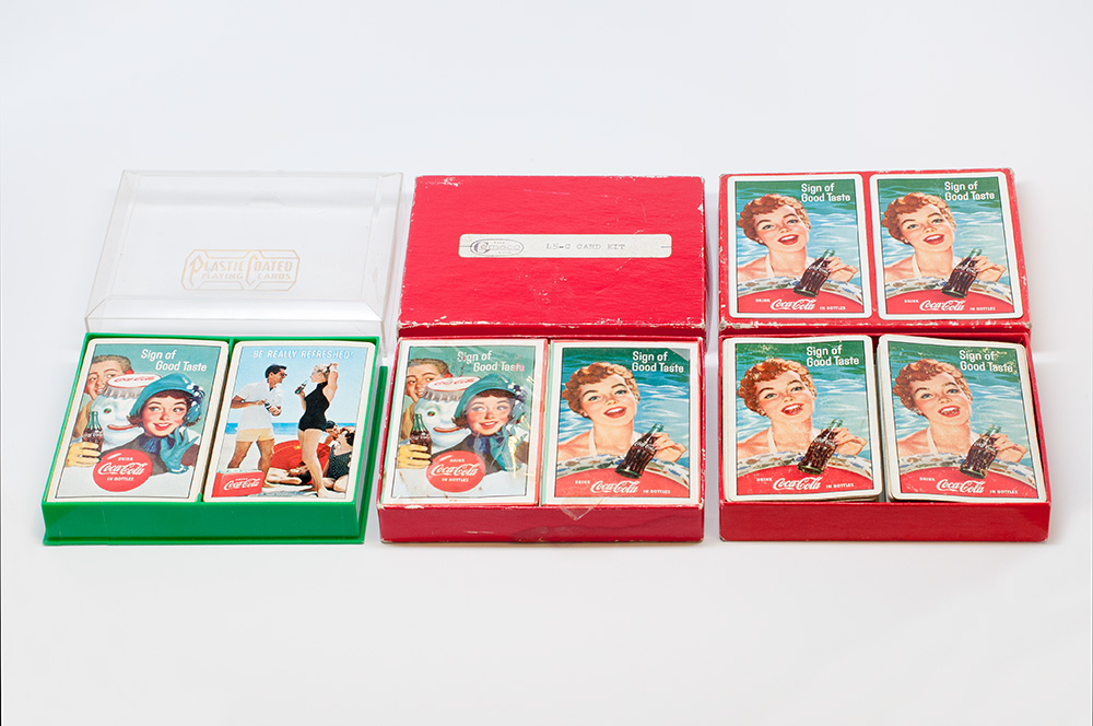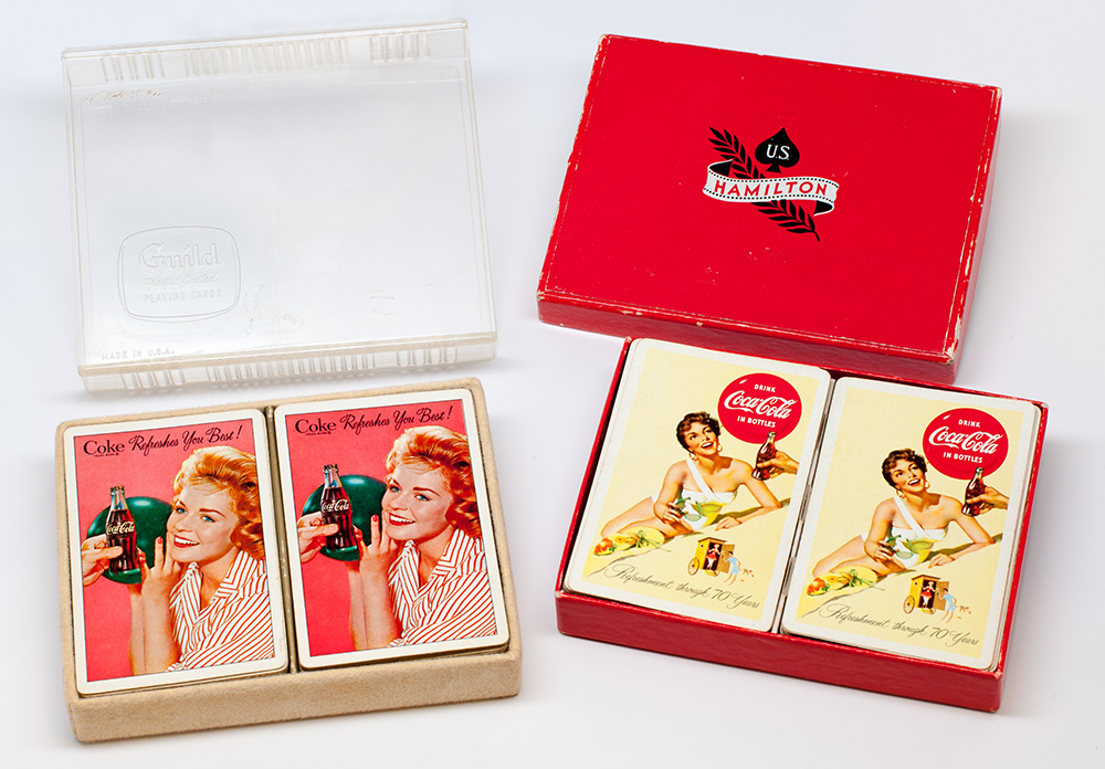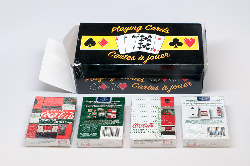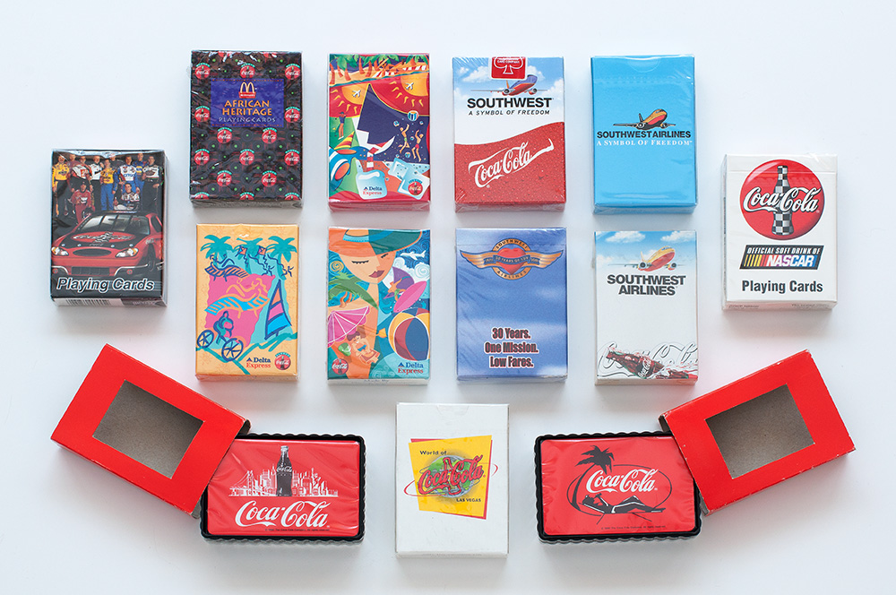 View in GalleryOver the last three or four decades the Company began to intentionally produce decks either to be sold as novelty items or to collectors. These are available in large quantities and in my opinion have no value. As you can see some of these decks reproduce older, original advertising images. Some are associated with other companies, for example, the Southwest and Delta airlines decks. Also included are the large variety of “Enjoy” and “wave” decks, as well as a number with a can image on the cards. These date from the 1960s forward and there are many types of boxes, trademark and logo styling and other variations.