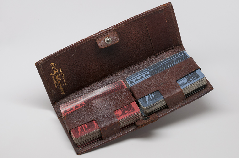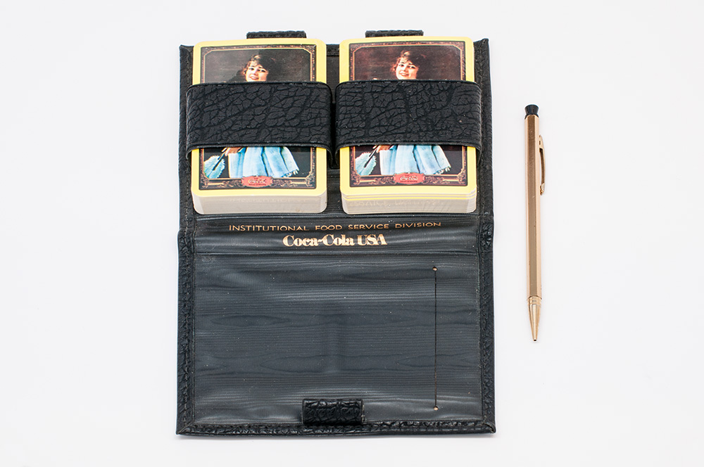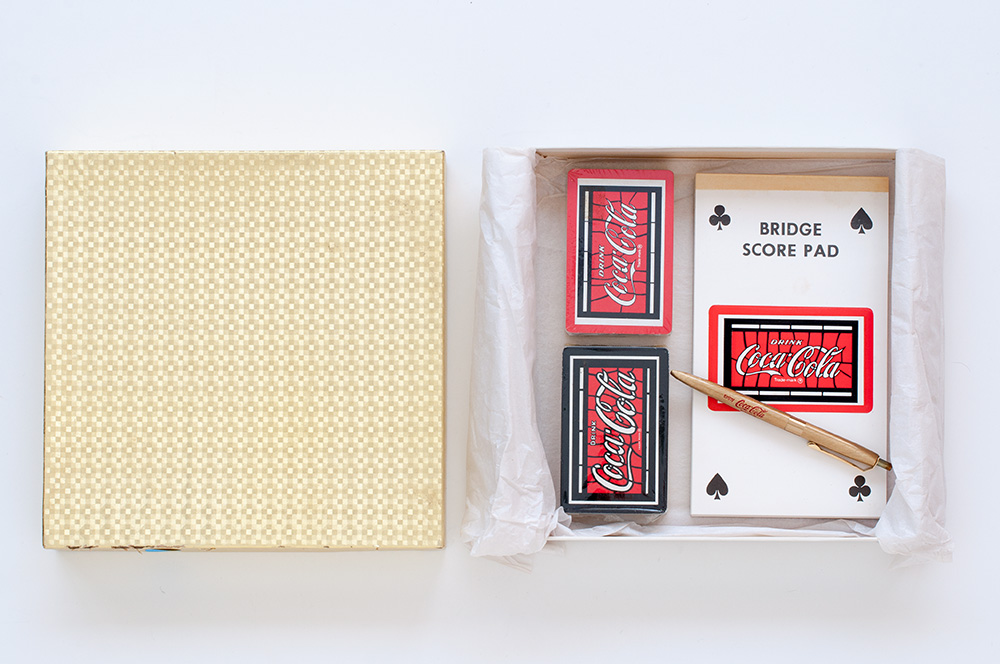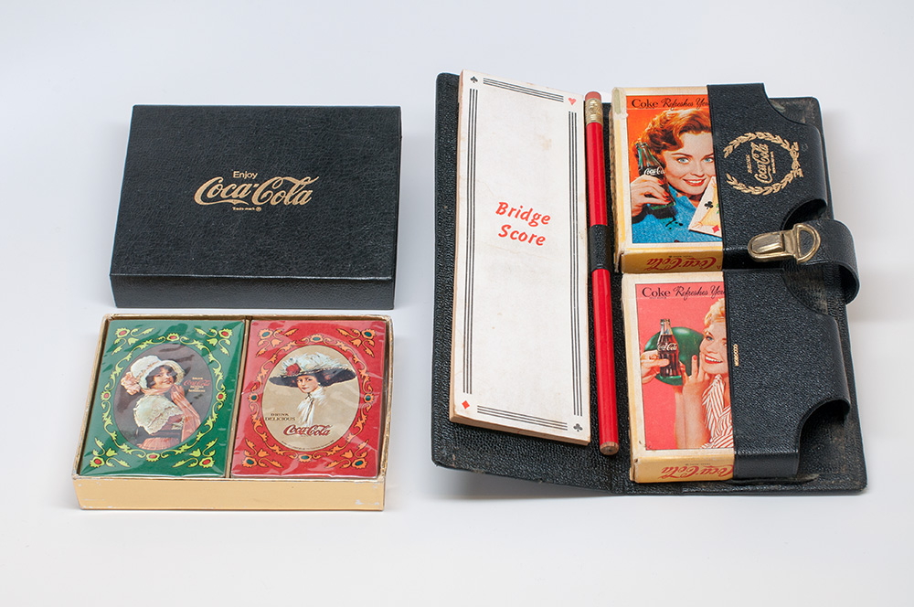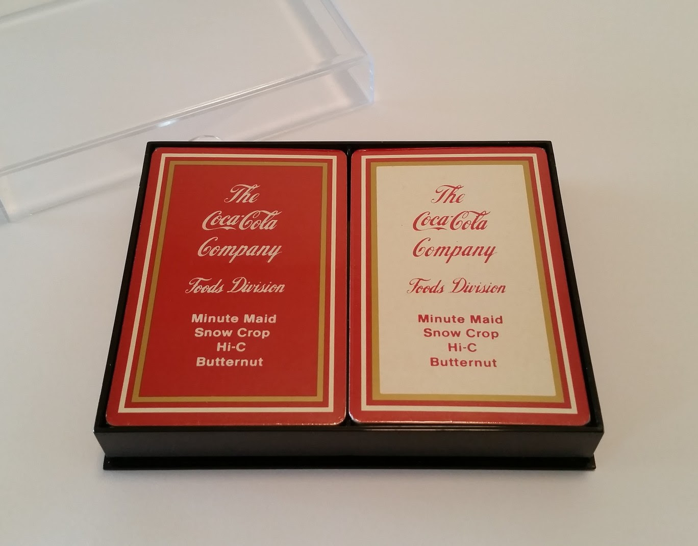 View in GalleryShown are several double deck sets, most of which I think were probably gifts to customers or rewards to employees. The first comes from the Coca Cola Bottling Company of New York and appears to be tan leather. The cards inside are not Coca-Cola decks and are bridge decks. They were manufactured by the US Playing Card Co. Based on the bridge information card and the bridge information at the back of the score pad, this appears to be from the late 1930s or early 1940s. Another one is a darker leather, and is labeled as “Meritorious Service 1952 Hund & Eger”. It also does not have Coca Cola cards inside. The cards are bridge decks presumably were produced before or in 1952 and were manufactured by the US Playing Card Co. They are labeled “606 Congress" with an M 1662 code on the ace of spades and a 56 79 code on one of the extra cards/jokers. Another one is also tannish leather with “Drink Coca-Cola” on the outside. The cards are the reproduction early Coca-Cola girl decks. The score pad is in English and French, making me wonder if this is Canadian. I would guess it is from the 1970s or 80s. It has an unusual pen and loop closer. Next is a white or ivory leather that has “Drink Coca-Cola” in the fishtail logo stamped on the deck holders. The decks are bridge and not Coca-Cola. They were manufactured by the International Playing Card Company in Windsor, Canada. I would guess they were made in the late 1950s or early 60s. Next is a greyish/tan vinyl-like set with “Enjoy Coca-Cola” on the cover and two of the reproduction of early Coke girls decks inside. I am guessing 1970s for this set. The outer box is with this set. Next is a black leather set holding the decks lengthwise. This set has “Drink Coca-Cola” on the deck holder in gold with a leaf circle. It came with a used bowling girl and bridge-playing girl pair of Coca-Cola decks, so I am assuming it dates from about 1961. Next is a black vinyl double deck of the flapper girl set that says “Institutional Food Service Division Coca-Cola USA” on the inside, which is probably a meeting give away. Next is another set of early Coke girl reproduction decks with “Enjoy Coca-Cola” on a black cardboard box. I assume this is from the 1970s. A set in a plastic box with a gold and red “Enjoy Coke” with a wave metal label has two non-Coke decks in it. They have a fleur de lis design and say on the one card that can be seen that they were made for Zippo by the US Playing Card Co. I would guess 1970s or 1980s for this set. A nice wooden box with a metal engraving of the Coca Cola Company headquarters had no decks in it. Another wooden box with the Have a Coke and a Smile logo and multiple country logos around that also had no decks in it. A set of double decks came in an unusual fold-out holder that does not have Coca Cola on it but has a diet Coke and an “Enjoy Coke” with a wave deck, so I think this is from the 1970s. Decks are sealed and I am not sure who the manufacturer is. Finally, there is the eight pack double deck, said to date from 1970. The cards have four Coke bottles on them and the decks are sealed so I again cannot identify the manufacturer.