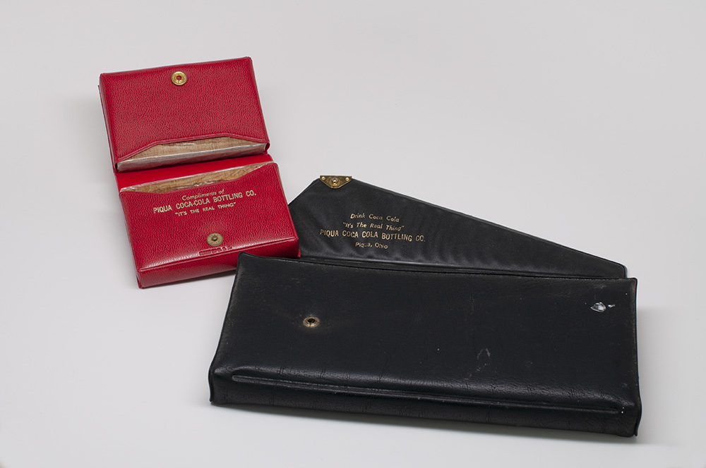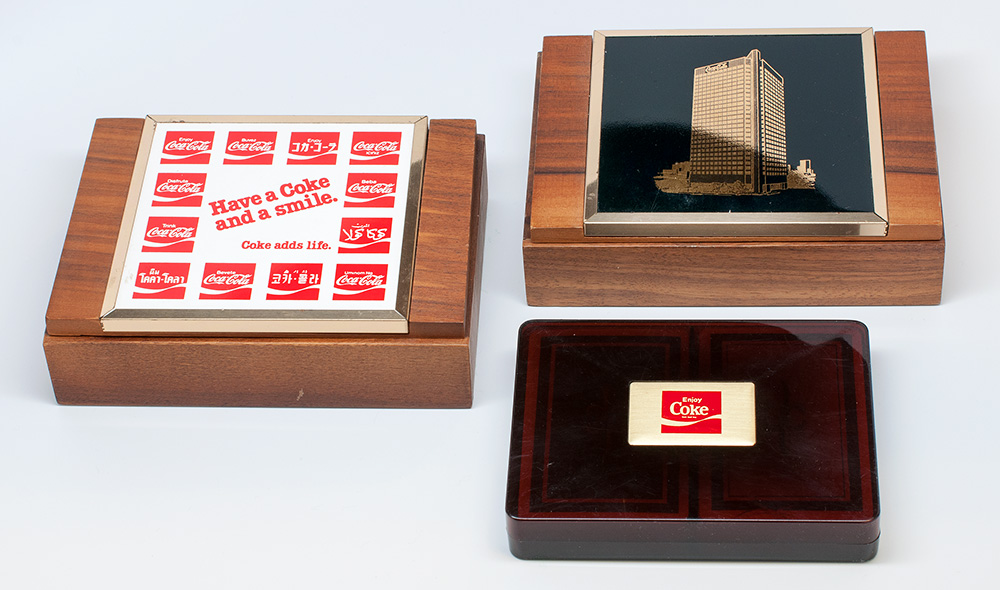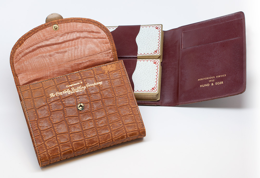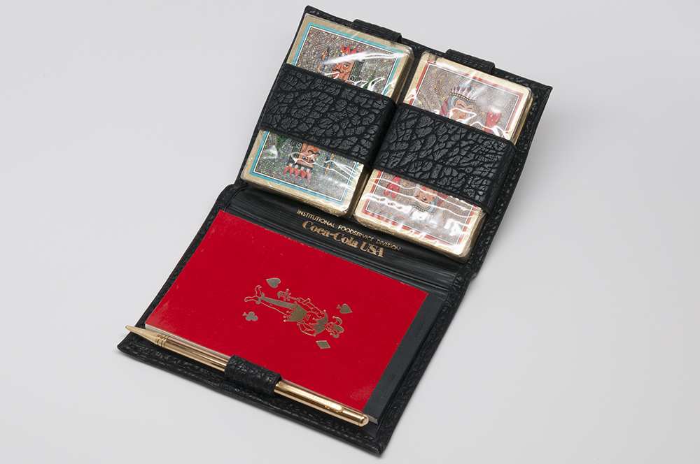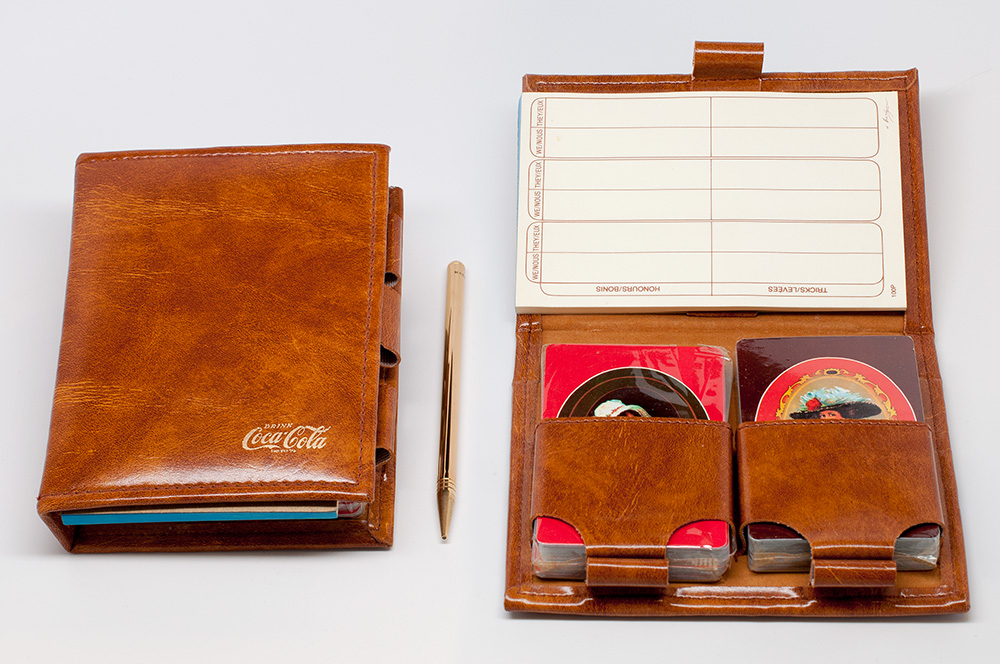 View in GalleryShown are several double deck sets, most of which I think were probably gifts to customers or rewards to employees. The first comes from the Coca Cola Bottling Company of New York and appears to be tan leather. The cards inside are not Coca-Cola decks and are bridge decks. They were manufactured by the US Playing Card Co. Based on the bridge information card and the bridge information at the back of the score pad, this appears to be from the late 1930s or early 1940s. Another one is a darker leather, and is labeled as “Meritorious Service 1952 Hund & Eger”. It also does not have Coca Cola cards inside. The cards are bridge decks presumably were produced before or in 1952 and were manufactured by the US Playing Card Co. They are labeled “606 Congress" with an M 1662 code on the ace of spades and a 56 79 code on one of the extra cards/jokers. Another one is also tannish leather with “Drink Coca-Cola” on the outside. The cards are the reproduction early Coca-Cola girl decks. The score pad is in English and French, making me wonder if this is Canadian. I would guess it is from the 1970s or 80s. It has an unusual pen and loop closer. Next is a white or ivory leather that has “Drink Coca-Cola” in the fishtail logo stamped on the deck holders. The decks are bridge and not Coca-Cola. They were manufactured by the International Playing Card Company in Windsor, Canada. I would guess they were made in the late 1950s or early 60s. Next is a greyish/tan vinyl-like set with “Enjoy Coca-Cola” on the cover and two of the reproduction of early Coke girls decks inside. I am guessing 1970s for this set. The outer box is with this set. Next is a black leather set holding the decks lengthwise. This set has “Drink Coca-Cola” on the deck holder in gold with a leaf circle. It came with a used bowling girl and bridge-playing girl pair of Coca-Cola decks, so I am assuming it dates from about 1961. Next is a black vinyl double deck of the flapper girl set that says “Institutional Food Service Division Coca-Cola USA” on the inside, which is probably a meeting give away. Next is another set of early Coke girl reproduction decks with “Enjoy Coca-Cola” on a black cardboard box. I assume this is from the 1970s. A set in a plastic box with a gold and red “Enjoy Coke” with a wave metal label has two non-Coke decks in it. They have a fleur de lis design and say on the one card that can be seen that they were made for Zippo by the US Playing Card Co. I would guess 1970s or 1980s for this set. A nice wooden box with a metal engraving of the Coca Cola Company headquarters had no decks in it. Another wooden box with the Have a Coke and a Smile logo and multiple country logos around that also had no decks in it. A set of double decks came in an unusual fold-out holder that does not have Coca Cola on it but has a diet Coke and an “Enjoy Coke” with a wave deck, so I think this is from the 1970s. Decks are sealed and I am not sure who the manufacturer is. Finally, there is the eight pack double deck, said to date from 1970. The cards have four Coke bottles on them and the decks are sealed so I again cannot identify the manufacturer.