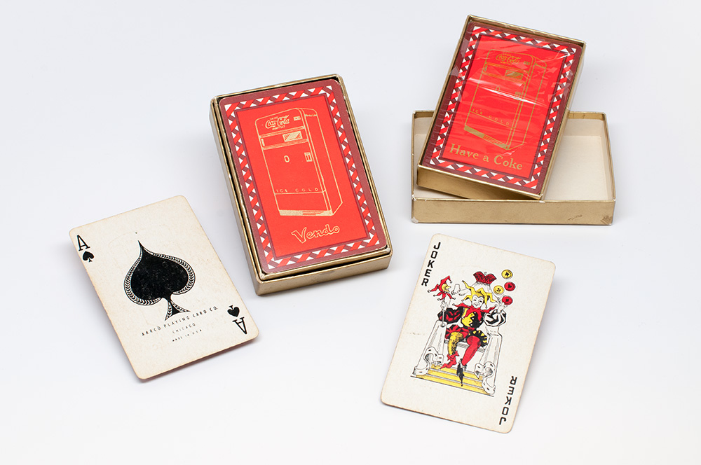 View in GalleryA deck that celebrates the Milwaukee Bucks, put out by White Hen Pantry in the 1970s, with pictures of the players on cards. Bruce Jacobs sent the photo of the deck that is identical but does not have the basketball players. A boy scout jamboree deck from 1971, red cards with a white Drink Coca-Cola wave logo box. Vendo machine decks, red, with a soda machine outlined in gold, some of these decks have Vendo at the bottom of the cards and some say “Have a Coke”. The border is laced red and burgundy. From the ARRCO playing card company and I would estimate dating to the 1950s.