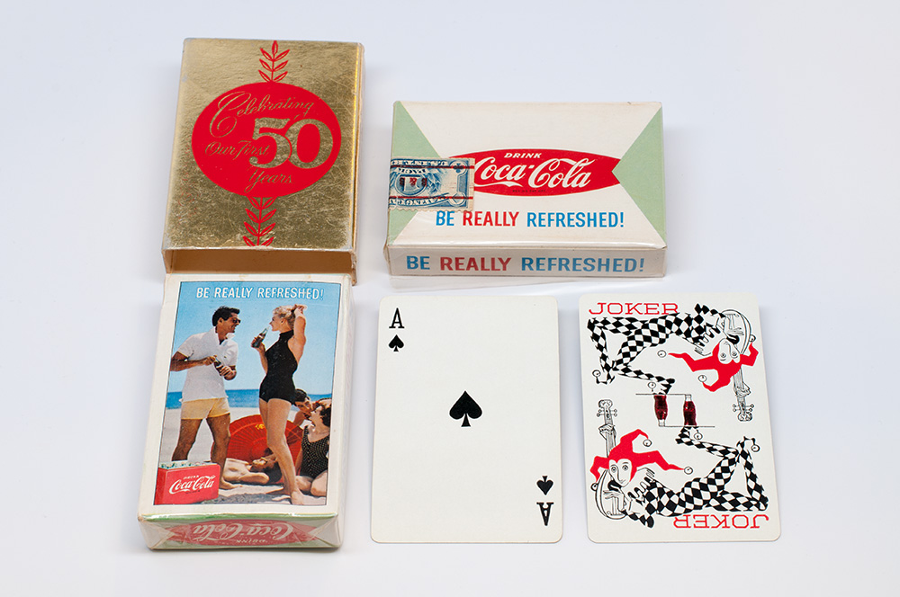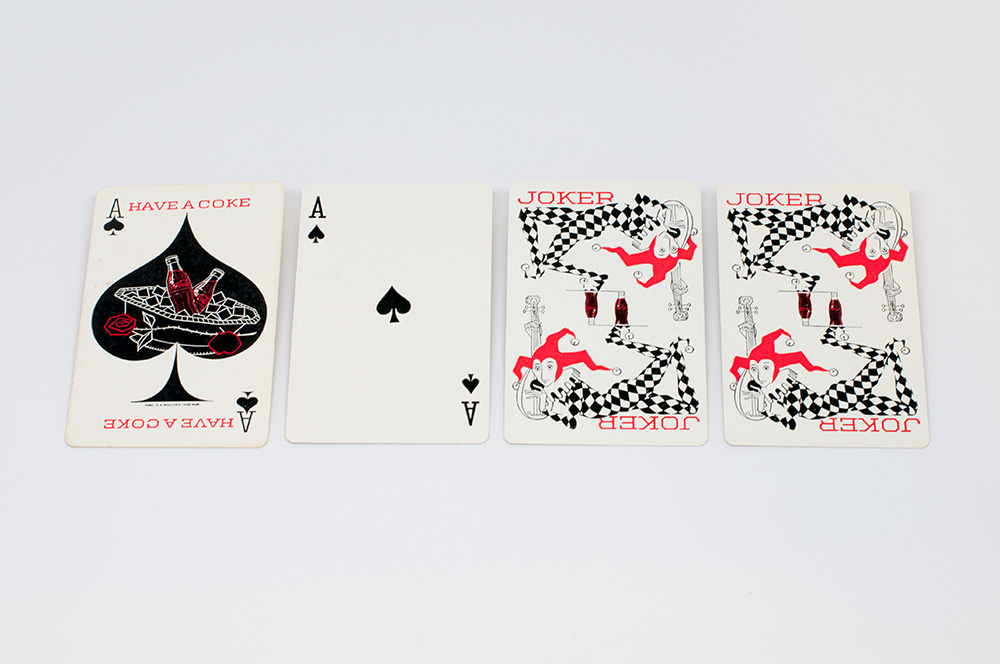 View in GalleryThe next set is from 1956 and has a girl on the beach on one deck and a skater girl on the other. These decks are labeled with Refreshment through 70 Years as they are issued in the 70th year since the Company’s founding. Quite by accident I noticed that a few of the beach girl decks have a different ace. Both aces are shown in the pictures. There are different aces because the manufacturer of the deck switched at some point. I have not observed this with the skater girl deck or with other Coca-Cola decks but I assume it is possible that has happened. I also have seen one of the beach girl decks with a gold slip cover that is from the Coca-Cola Bottling Company and says it is celebrating its 50th anniversary.