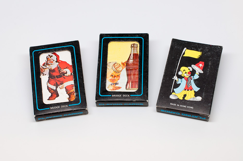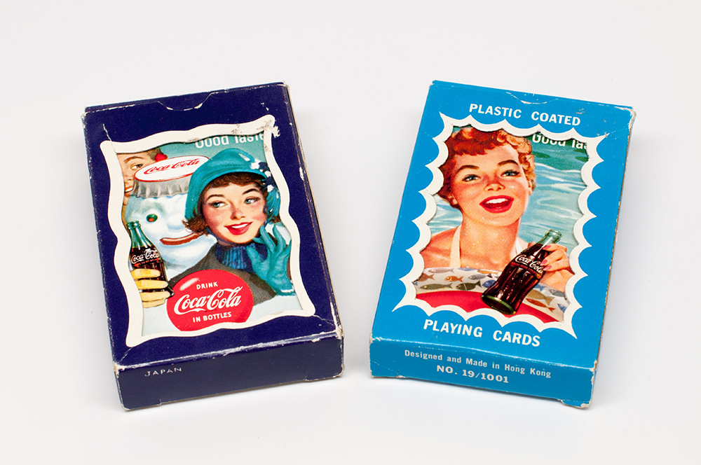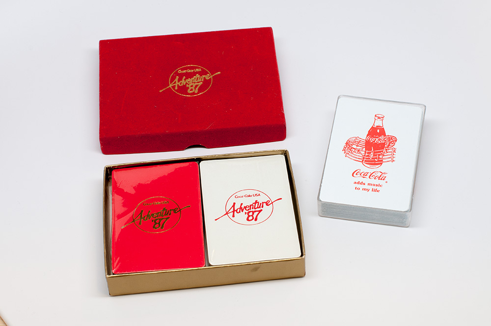 View in GalleryAs we got into the 1970’s and 1980s, a number of decks were put out, some in large quantities, some smaller, some ordered by the Company, some probably by bottlers and some not authorized. In no particular order in regard to the photos are two 1973 decks with the “it’s the real thing” theme; one has a girl sitting in grass and the other a spread of food and Coke. A pair of tennis decks from 1975 made by TDC Inc. Shows two different couples playing tennis, comes in single and double deck versions. There are a number of “Have a Coke and a Smile. Coke Adds Life.” Decks. Some have a red background and some a white. There are single and double decks and one white background version has an Enjoy Coca-Cola box logo. Also are a large number of “Coke is It” decks, red background, variations in the trademark. Two “Coca Cola adds life to everything nice” decks, with images of different activities, that date to 1976 or so. Two versions of decks with the same phrase but in repeated running script, one red and one black on white backgrounds, some single, some double decks. A pair of decks, found single in a gold box or double in a plastic case, one image is a soldier playing with an infant and one is young men in a soda fountain. The so-called Tiffany decks, with a veined red background and red or black border. They say “Drink Coca-Cola” Some are in silver cutout top boxes, some in gold. There are also double decks. There are variations of the border size and trademark statement. These are from the 1970s. A relatively hard to find 75th Anniversary Enjoy Coca-Cola deck from Hygeia bottling company, in a silver cutout top box. A white background, red print old soda machine deck in a gold cutout top box, made by Gemaco, likely from the 1970s. A Race for Safety deck, made by the Company or a bottler, likely for employees, with safety tips on each card, probably from the 1970s. “Coca-Cola adds music to my life” deck, white background, red image and words. Perhaps made by Liberty, likely from the 1970s. An Adventure 87 double deck, one red, one white in a red feltish box. This deck was made in 1987 for a competition among bottlers in which the winners won a trip. A pair of similar decks in a black cutout box is also likely from the 1970s, with Santa on one deck and the Sprite Boy with a bottle on the other. There is a yellow border with a flapper girl deck, made in Hong Kong. There is an Asian woman with a bottle deck, yellow border, Have a Coke and a Smile on the sides of the box, also likely made in Hong Kong. Several decks with pictures of older advertising female images, including a double deck.